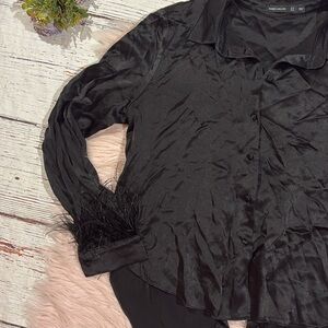 Karen Millen Satin Crepe Feather Trim Black Layered Black Blouse. This top is in great used condition