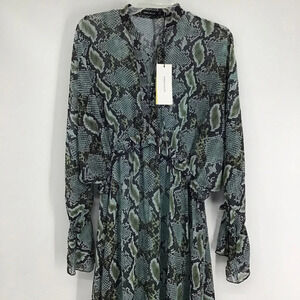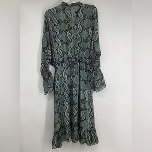 Lovely Karen Millen snake print flowy midi dress. Great dress for fall transition season.. Features lace up front design, bell sleeve with tie elastic sleeve, elastic at waist (hard to see for ruffles) long sleeves, slip-over head style, ruffles at bottom, waist & sleeve & has separate under slip lining.