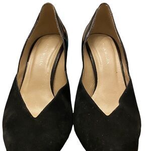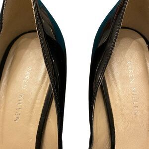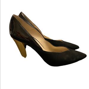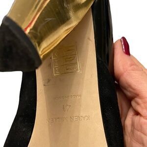 Karen Millen Sz 10 Black Suede Patent Leather Gold Chunky Heel Classic Pumps