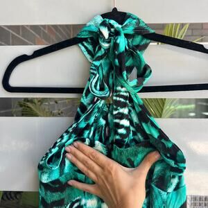 Karen Millen turquoise & black tiger printed satin viscose tunic top with gold ring front halter neck design. V-shaped front & back body drape silhouette. Sleeveless. In excellent condition, has been dry-cleaned. Size US 2 and fits like a 2/4. 13" from pit on side seam.