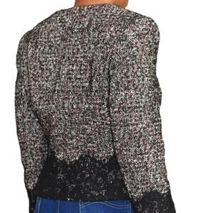 Karen Millen blazer jacket FEATURES a black and white tweed fabric with a hint of red. Scalloped lace trims the lower hem and cuffs. Collarless Shawl collar. V neckline. Front clasp closures.