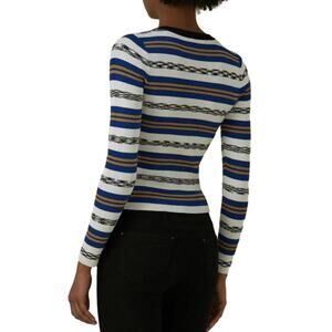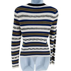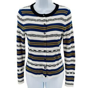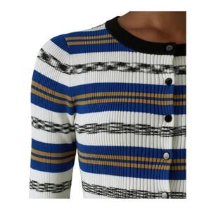 Karen Millen White Blue Gold Striped Rib Knit Snap Closure LS Cardigan Sweater S