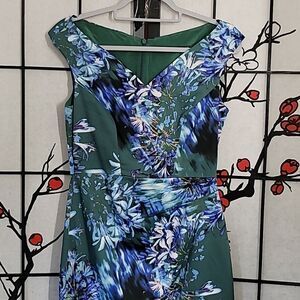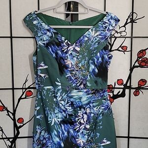 Karen Millen Womens Back Zip V Neck Floral Sheath Dress Green Blue Size 8