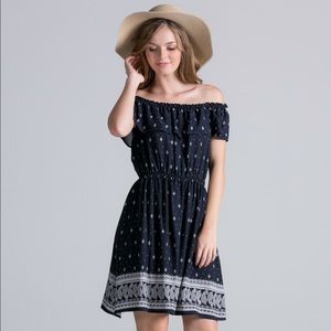 -SHORT DRESS -OFF SHOULDER -ELASTIC BAND IN WAIST -NAVY COLOR -MADE IN USA -100% RAYON -LENGHT: 32" -CHEST: 19"