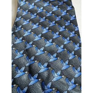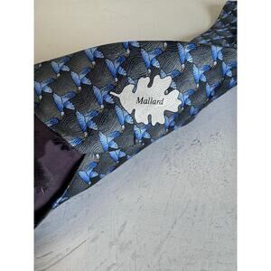 Elevate your wardrobe with this unique Karen Pierce necktie featuring a repeating mallard duck pattern in shades of blue on a dark background. Handmade from 100% imported silk, this high-quality tie is perfect for bird lovers, hunters, or collectors of wildlife-themed fashion.