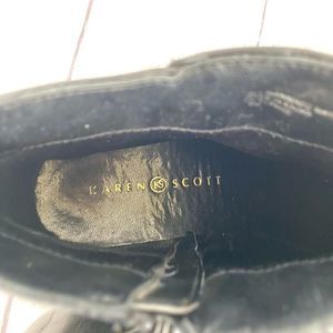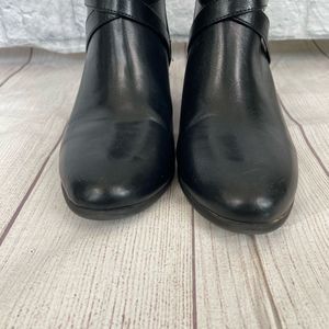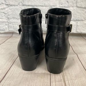 Sleek black ankle boots. Gold buckle detail. Low block heel. Perfect for versatile styling.