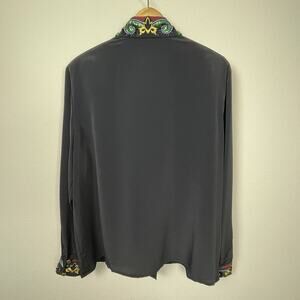 Karen Scott Black Button Up Long Sleeve Blouse Sz 16 Embellished Collar Cuffs Whimsigoth Fairycore 100% Polyester Shoulder Pads