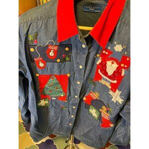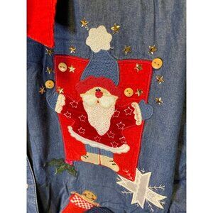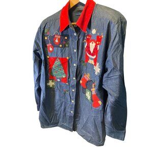 Embrace the holiday spirit with the Karen Scott Blue Denim Embroidered Collared Long Sleeve Button Up Shirt. Made of comfortable cotton, this 1X size top features a festive design perfect for seasonal celebrations.