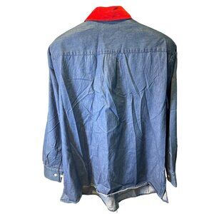 Karen Scott Blue Denim Holiday Embroidered Collared Long Sleeve Button Up Shirt