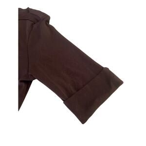 Chocolate brown boat neck knit top with short cuffed sleeves and side vents