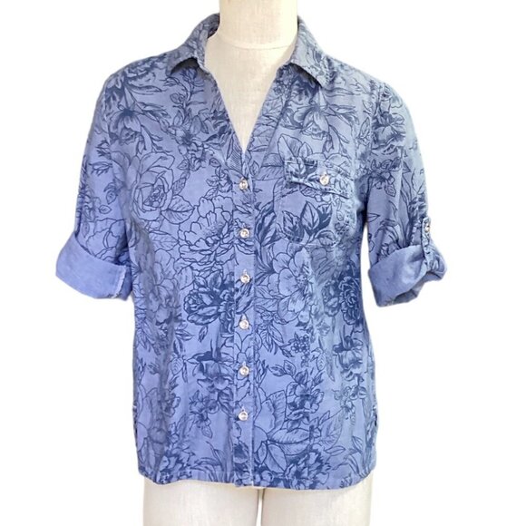Karen Scott Button-Up Roll Tab Top 100% Cotton Floral Sz S Blue 142C