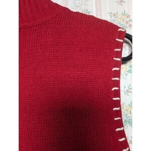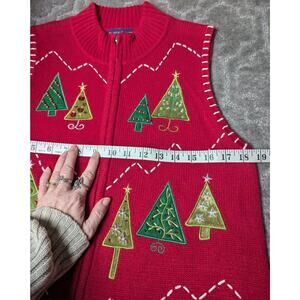 This is a Karen Scott Christmas tree sweater vest in size small, featuring a sleeveless style with a mock neck and full zip closure. The festive red vest is adorned with beaded accented Christmas trees and made of ramie and cotton materials, perfect for the holiday season. Note: shows a couple pulls/snags, very minor, beautiful sweater, ugly is in the title only for-can be used for ugly sweater day, good condition.