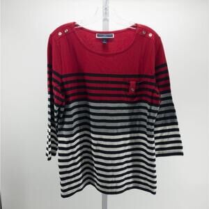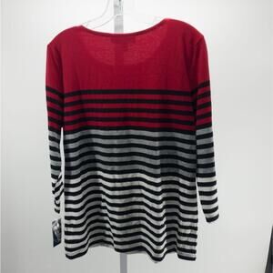 Karen Scott layers stripes over a vivid color-blocked design to create a charming elbow-length sleeve top, accented by a small pocket with a tab-snap detail. Scoop neckline Patch pocket with snap tab detail at front left chest Elbow-length sleeves Cotton/polyester Machine washable Imported SIZE: Womens MP CONDITION: New With Tags
