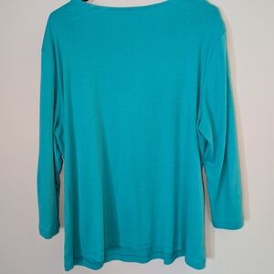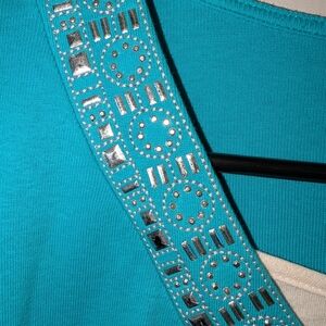 This stylish blue top by Karen Scott showcases a beautifully embellished neckline, perfect for adding a touch of elegance to any outfit. The 3/4 sleeves and soft fabric ensure comfort and versatility, making it suitable for both casual and dressy occasions. The subtle silver embellishments provide a sophisticated flair, enhancing its overall appeal. Size XL, immaculate condition!