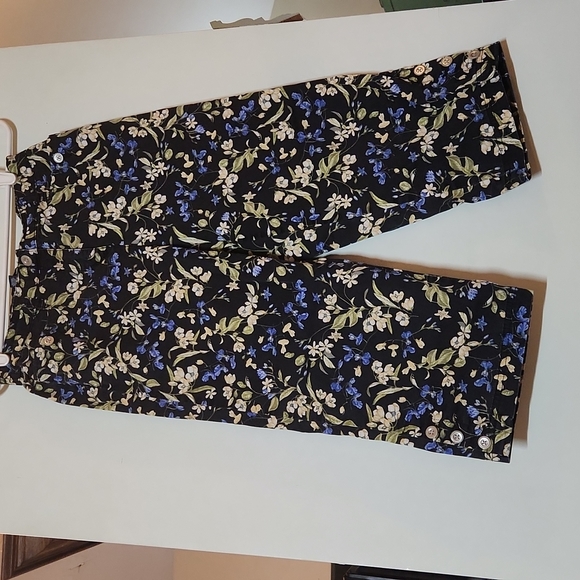 Floral Capri with front pockets. Decorative buttons on the bottom of legs.