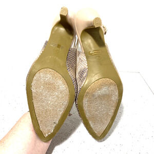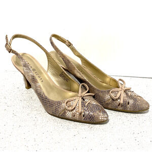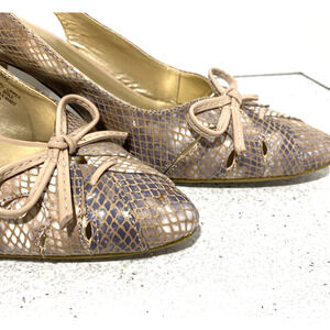 Karen Scott Glennaf slingback pumps shoes in US size 8M with faux snakeskin uppers and cute bows across the almond shaped toes. Adjustable buckle on the heel strap ensures a snug fit. These are a mottled tan nude biege color - the patent covered heels are about 3.25” high - a classic dressy look perfect for career to event. Gently worn - minimal wear primarily on the soles - no flaws.