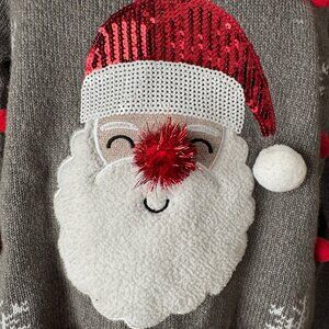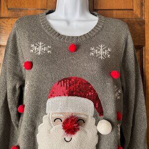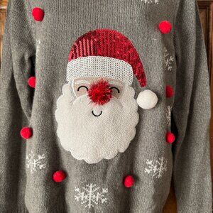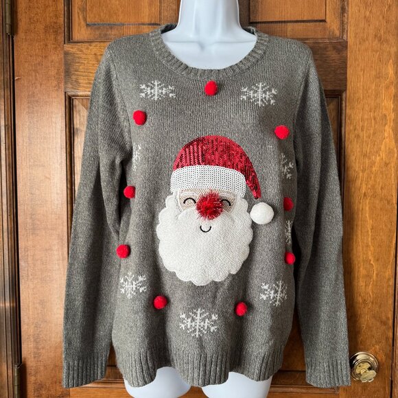 Karen Scott; Pullover Sweater; Gray; Medium; Front: White Snowflakes; Santa Claus Face w/Red & White Sequin Hat; White Pom Pom; Gold Sewn Face; Red Pom Pom Nose; White Fleece Beard; Red Pom Poms surround Santa face; Ribbed Cuffs & Hem; 100% Acrylic; Machine Wash & Tumble Dry; Armpit to Armpit 19"; Armpit to Hem 16"; Sleeve 20"; Length 25"