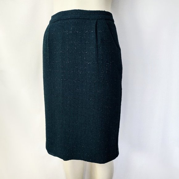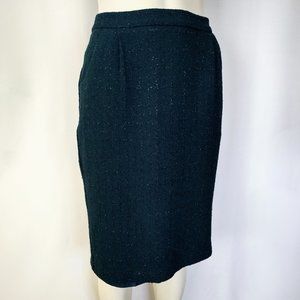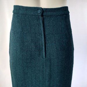 Beautiful green skirt made from weaved, textured fabric. It has a grid pattern design, with strings of what looks like dark green metallic threads. 2 large side pockets. Kick pleat to allow for comfortable movement. Back zipper and button closure. It has a darts around the waistline for a flattering, slimming silhouette. Fully lined.