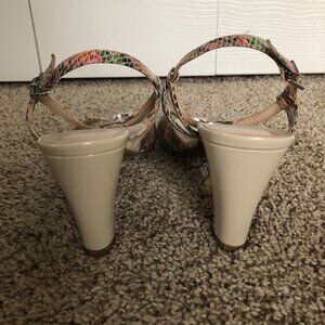 These are the Lorah heels by Karen Scott. They are in a tan color with fun, colorful straps with hardware detail. The strap around the ankle is adjustable. They have block heels and open rounded toes. They are perfect to wear in the summertime to a party or as a wedding guest. They are in excellent pre-owned condition with no holes, rips or stains. Bundle with other items from my closet to get the most out of shipping!