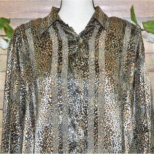 Karen Scott Ladies L Gold Metallic Cheetah Animal Print Button Up Blouse Tunic S