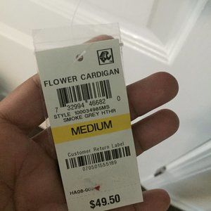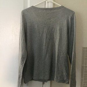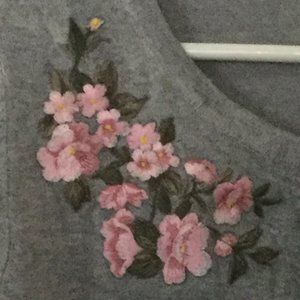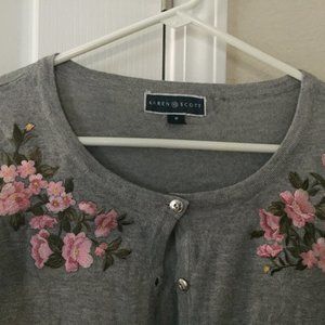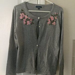 Cute gray sweater style shirt with flower decoration on the front, button-down, long sleeves, new with tags.