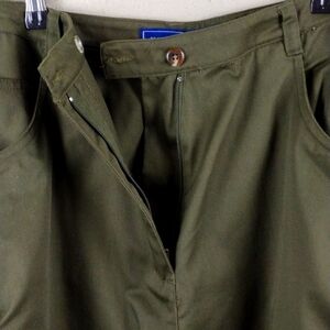 Karen Scott Vintage Women's Plus Olive Green High Rise Pleated Front Five Pocket Two Button Zipper Front Closure Hiking Casual Bermuda Cargo Shorts. 65% Polyester, 35% Cotton. Open Front Pockets. Two Thigh Velcro Flap Pockets. No Back Pockets. Belt Loops. Measurements approx. Flat Lay. Waist: 15, Rise: 14, Hips: 23, Inseam: 6". Size 16. NWT Color May Vary Due To Lighting.