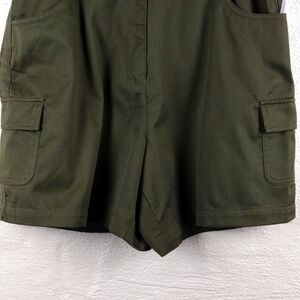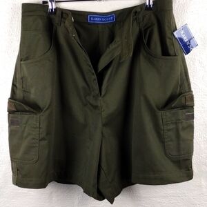 Karen Scott Vintage Women's Plus Olive Green High Rise Pleated Front Five Pocket Two Button Zipper Front Closure Hiking Casual Bermuda Cargo Shorts. 65% Polyester, 35% Cotton. Open Front Pockets. Two Thigh Velcro Flap Pockets. No Back Pockets. Belt Loops. Measurements approx. Flat Lay. Waist: 15, Rise: 14, Hips: 23, Inseam: 6". Size 16. NWT Color May Vary Due To Lighting.