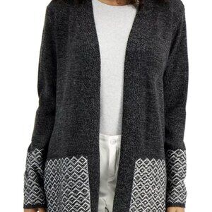 Great condition: Gently preowned. No visible flaws. Open front and relaxed, generously cut silhouette. Thick knit fabric with cozy texture. Contrast pattern at lower sleeves and hem; vented hem