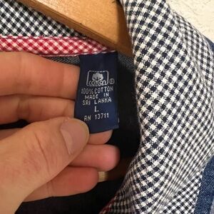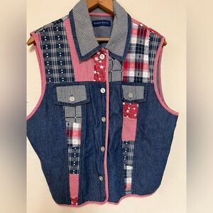 Stylish patchwork denim vest with a mix of red, blue, and white patterns. Features button closure and front pockets.