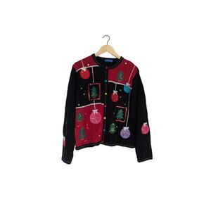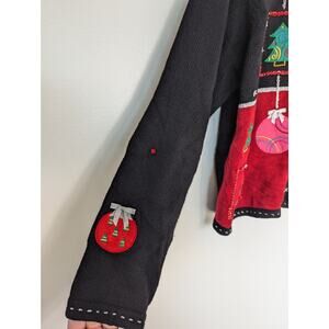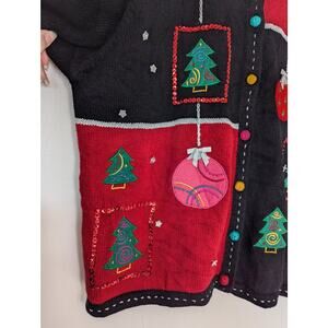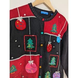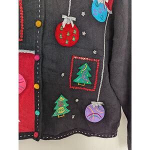 Karen Scott Sport Petite Embroidered Ornaments and Trees Ugly Christmas Sweater Cardigan. Has a few random placed sequins, stars, colorful buttons with an extra button inside.