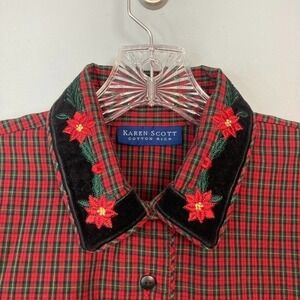 Karen Scott Red Green Plaid Velvet Poinsettia Collar Button Up Shirt Size M Holiday. Karen Scott Cotton Rich Christmas theme button up shirt. Embroidered poinsettia flowers on a velvet trimmed collar. Lightweight, 60% cotton, 40% polyester. Machine wash, tumble dry. In great, pre-owned condition. Measurements taken flat: pit to pit 21.75", sleeve length: 23.5", sleeve opening: 3.5", shoulder to hem length: 24". Holiday, Festive, Christmas, Poinsettia, Embroidered, Plaid, Modest.
