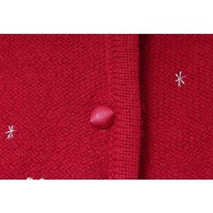 Vintage Karen Scott Sport red 100% wool embroidered Christmas holiday cardigan sweater. Scattered sequins. Embroidered Christmas trees & snowflakes. Satin covered buttons. Excellent condition!