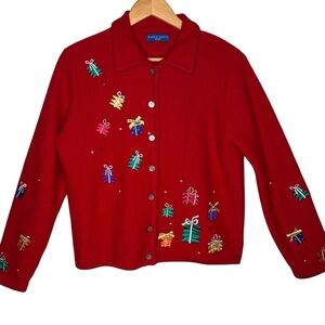 Karen Scott Sport Red Wool Embroidered Holiday Gifts Bows Button Cardigan Sweater Size M