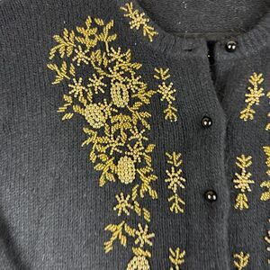 ~ Solid black knit with small black buttons up the front. Stunning beadwork in shades of champagne and gold around the neck, cuffs and up the front panels. Snowflakes and pinecones?? Absolutely stunning!