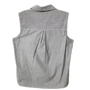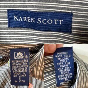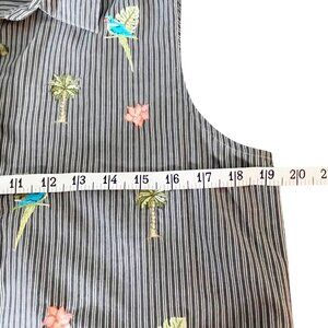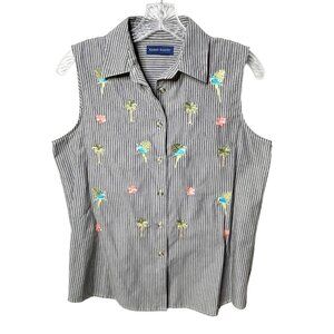 Tags: Karen Scott top, Sleeveless top, Embroidered top, Tropical birds, Palm trees, summer fashion, Casual wear, small size, Lightweight top, Women's top, Vacation wear, Beach style, Comfortable clothing, Striped, Button Up, Collared