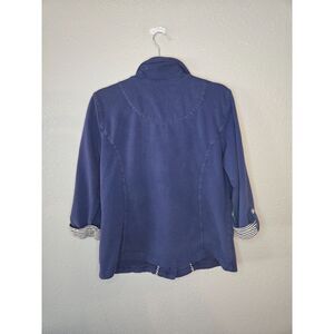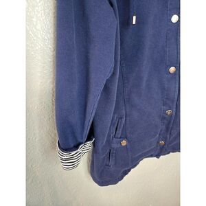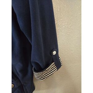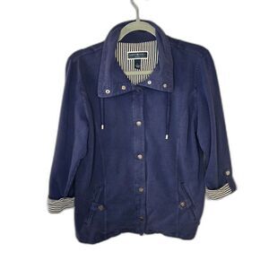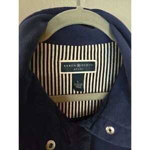 Karen Scott Sport Women's Navy Blue Button U p Jacket. Striped Cuffs. 2 Front Pockets with Button Closure. Cotton Blend - 97% Cotton; 3% Spandex. Summer. Fall. Spring. Nautical. Ocean. Beach. Casual. Preppy. Size Large. Excellent Used Condition.