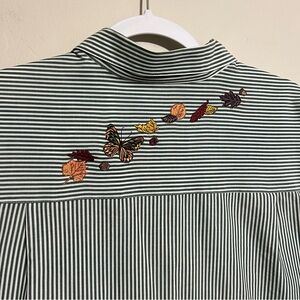 Karen Scott cotton-rich embroidered gray and white striped button-down blouse with an embroidered fall leaves and butterflies design.