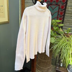 The classic, lightweight ribbed turtleneck sweaters of the 90s are a cold weather wardrobe layering staple. The clean winter white is a good neutral to style and the ribbed knit cotton fits like a dream, it's a 90s medium so it runs big, please see the measurements. Made in the UK, 100% cotton fitted ribbed knitwear