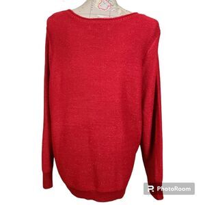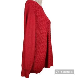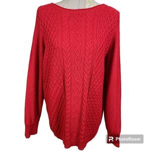 Karen Scott Woman, Size 1X, Red, Sparkling, Scoopneck Longline Cable Knit Sweater, Colorful, Metallic, Shimmer, Fisherman, Nautical, Preppy, Valentine's Day, Pre-owned Fashion, Casual, Plus-Size Fashion