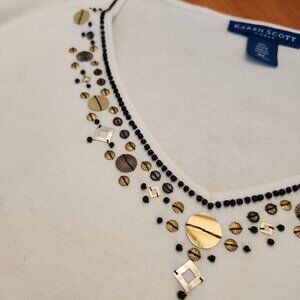 Add a touch of effortless elegance to your wardrobe with this crisp white cotton top from Karen Scott. Featuring a flattering V-neckline adorned with metallic gold and black beaded embellishments, this piece brings subtle sparkle to any outfit. Crafted from breathable 100% cotton, it’s ideal for layering or standing on its own for warm-weather occasions.