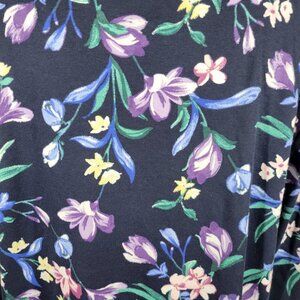The Karen Scott Women's Top in size 2X Plus features a lovely blue/purple floral pattern, 3/4 sleeves, and a V-neck with a quarter button closure. Made from a comfortable cotton blend knit fabric, this casual button-up top is perfect for travel and everyday wear. With a regular fit and stretchy material, it is suitable for all seasons and can be easily cared for with machine washing. The basic style and plus size design make it a versatile addition to any woman's wardrobe.