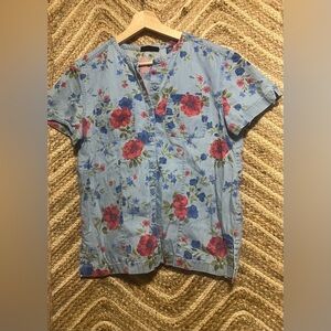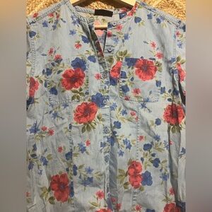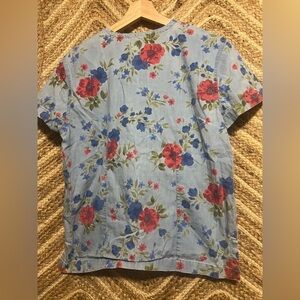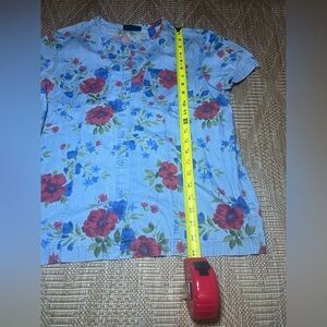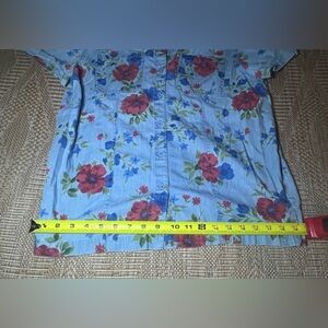 Karen Scott Women's Blue Short Sleeve Blouse,Button Up,Red Flowers,Size PM