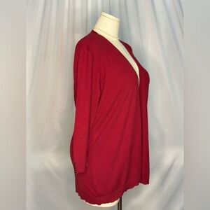 Karen Scott red open front cardigan. Features 3/4 sleeves with button detailing at the cuffs and ribbed texture on the shoulders. This elegant red women's sweater is perfect for any occasion. Its vibrant color adds a touch of sophistication to your wardrobe.
