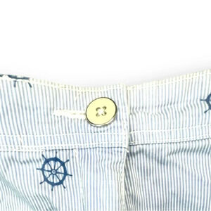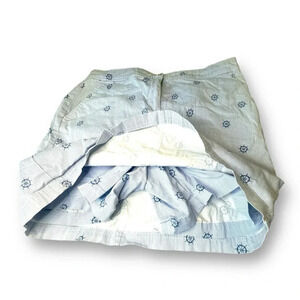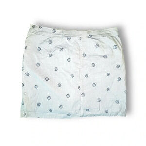 This Karen Scott women’s skort in size 10 features a fun nautical print with blue ship wheels against a white and light blue striped background.