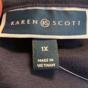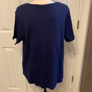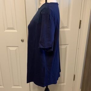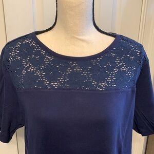 NWT Cotton knit crewneck top. Airy crochet floral detail at yoke. Relaxed fit. Size 1X Navy Blue. 23” PTP & 27.5” L