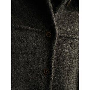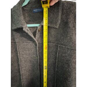 Crafted from 100% wool, this medium-sized Karen Scott cardigan jacket offers warmth and durability. Its button-front design and dark gray tone make it a versatile addition to any wardrobe. Note: minor sleeve damage present.