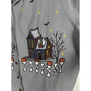 Karen Scott Women's XL Striped Halloween Haunted House Embroidered Blouse Top
