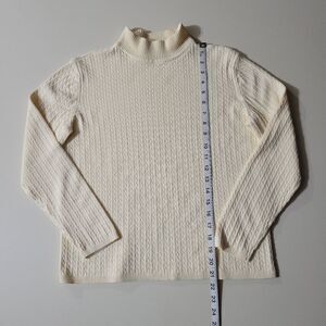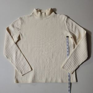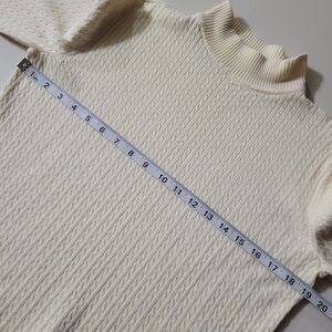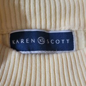 This pale yellow sweater by Karen Scott features long sleeves and a textured knit pattern with vertical ribbing throughout. The mock neckline and relaxed fit provide both comfort and style, making it perfect for layering on cooler days. Size/fabric label is missing, and info was obtained from website. Please consider all measurements provided prior to purchase. Beautiful condition.