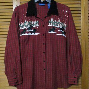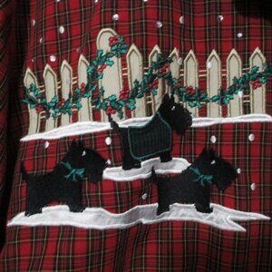 Karen Scott brand - Christmas button down blouse. Holiday plaid colors of red, white & black with a velvet like collar and all buttons are velvet like. Adorable "scotty dogs," picket fence with holly and some snow with appliques and embroidery. Like new condition.