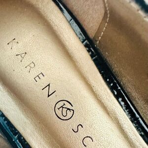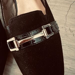 Step out in style in these black, slip-on pumps with gator embossed, patten heels and trim. Featuring gold, front buckle accent and 2 1/2” heels.